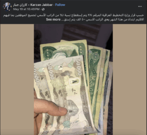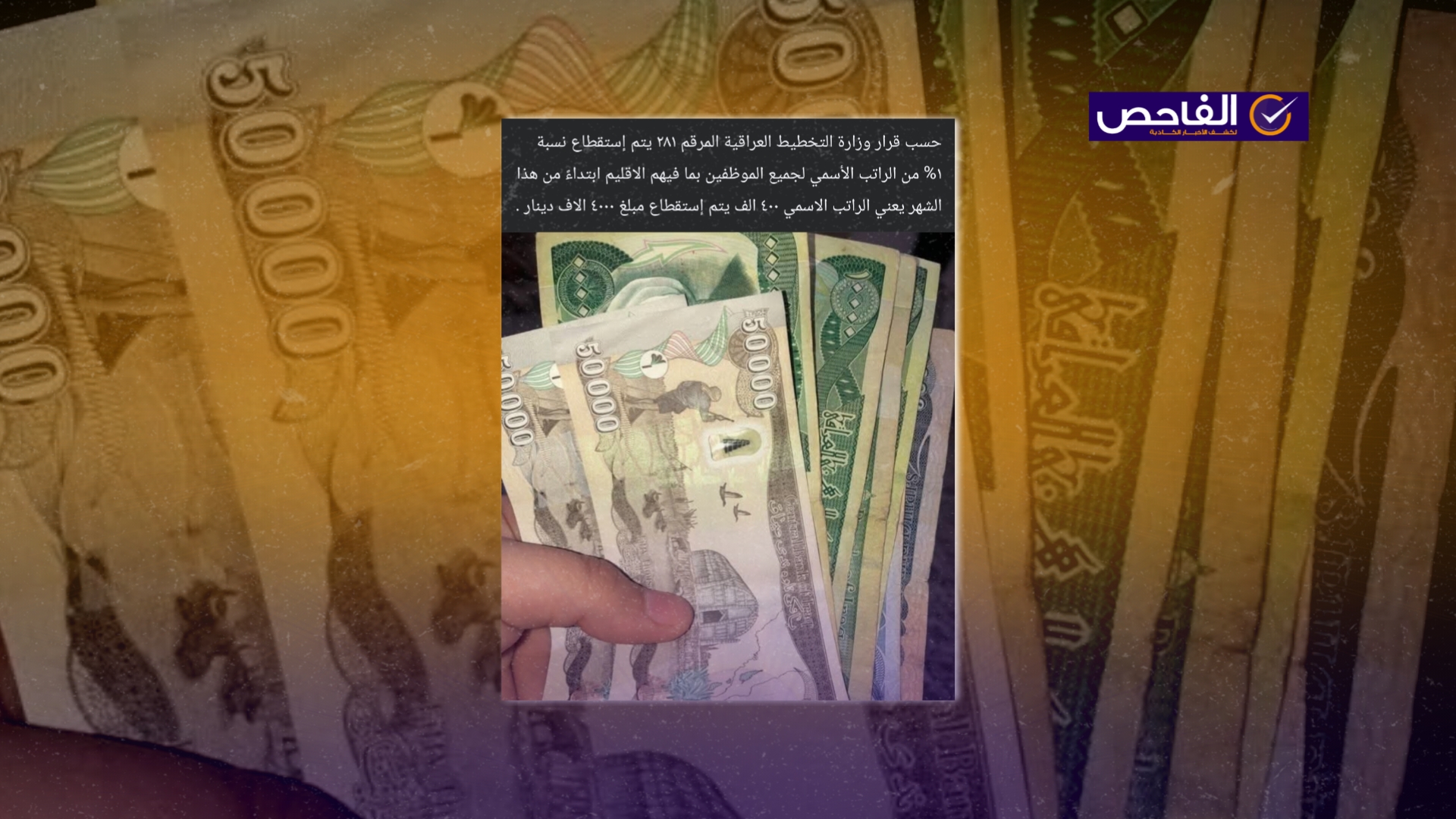 تداولت صفحات على موقع التواصل الاجتماعي فيسبوك نصّه (دون تصرف): “حسب قرار وزارة التخطيط العراقية المرقم ٢٨١ يتم إستقطاع نسبة ١% من الراتب الأسمي لجميع الموظفين بما فيهم الاقليم ابتداءً من هذا الشهر يعني الراتب الاسمي ٤٠٠ الف يتم إستقطاع مبلغ ٤٠٠٠ الاف دينار” حصل الادعاء على اكثر من 500 تفاعل وتعليق ومشاركة.