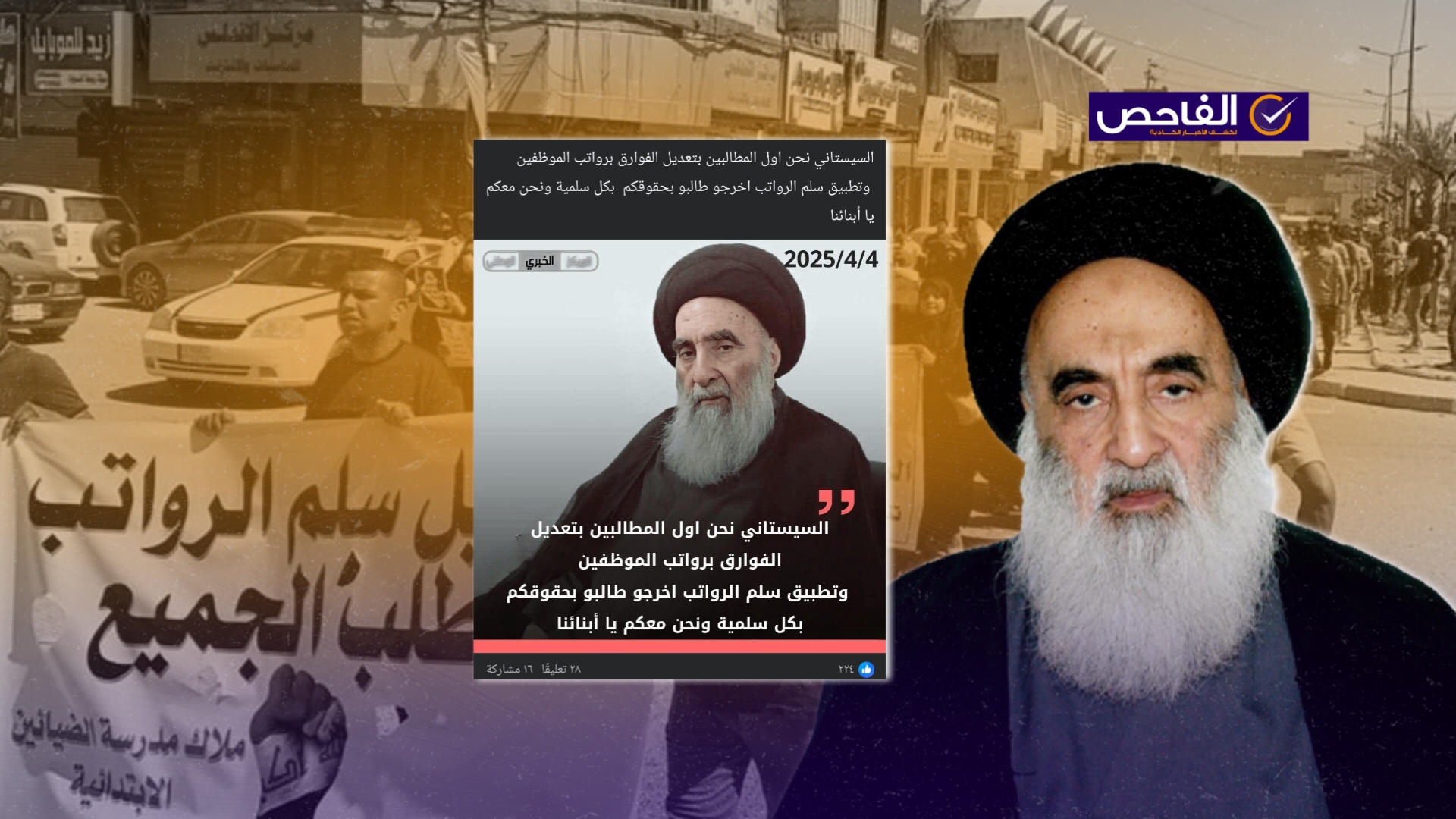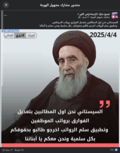 نَشرت صفحاتٌ على موقع التواصل الاجتماعي، فيسبوك، تصريحاً منسوباً للمرجع الديني علي السيستاني، على إنَّه قال (دون تصرّف): “نحن اول المطالبين بتعديل الفوارق برواتب الموظفين وتطبيق سلم الرواتب اخرجو طالبو بحقوقكم بكل سلمية ونحن معكم يا أبنائنا”. وتفاعل مع الادّعاء وشاركه الآلاف من المستخدمين.