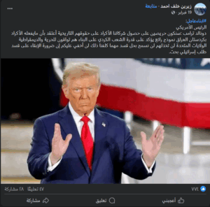 تداولت صفحات على مواقع التواصل الاجتماعي، وخصوصاً على منصّة فيسبوك، تصريحاً منسوباً إلى الرئيس الأميركي دونالد ترامب، نصّه (دون تصرّف): “سنكون حريصين على حصول شركائنا الأكراد على حقوقهم التاريخية أعتقد بأن مايفعله الأكراد بكردستان العراق نموذج رائع يؤكد على قدرة الشعب الكردي على البناء هم تواقون للحرية والديمقراطية الولايات المتحدة لن تخذلهم لن نسمح بحل قسد مهما كلفنا ذلك لن أخفي عليكم إن ضرورة الإبقاء على قسد طلب إسرائيلي بحت”. وحصد المنشور الآلاف من التعليقات والمشاركات على منصّة فيسبوك.