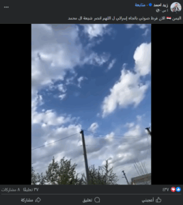 نَشرت صفحاتٌ عراقية على مواقع التواصل الاجتماعي، وخصوصاً على منصة فيسبوك، مقطع فيديو بالتزامن مع أصداء هجمات الاحتلال الإسرائيلي اليوم، ضد أهداف في إيران، نشرت فيديو على أنه يظهر إطلاق صواريخ فرط صوتية من اليمن تجاه مناطق الاحتلال الإسرائيلي، وأرفق بنص مفاده (دون تصرّف): “اليمن الان فرط صوتي باتجاه إسرائي ل اللهم انصر شيعة ال محمد”. وحصد الفيديو مئات التفاعلات على منصة فيسبوك، في الدقائق الأولى من نشره.