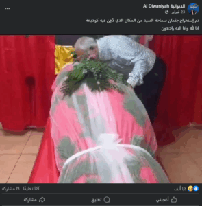 نَشرت صفحاتٌ على مواقع التواصل الاجتماعي وخصوصاً على منصّة فيسبوك، صورة بمزاعم أنها تعود لاستخراج جثمان الأمين العام السابق لحرْب الله حسن نصر الله، من المكان الذي دُفِن فيه كوديعة، وأرفقت الصورة بنص (دون تصرّف): “تم إستخراج جثمان سماحة السيد من المكان الذي دُفِن فيه كوديعة انا لله وانا اليه راجعون”. وحصد آلاف التفاعلات على مختلف المنصّات.