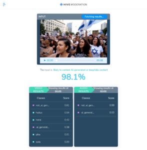وتعزيزاً للنتيجة التي توصل إليها فريقنا، تم إجراء فحص للفيديو من خلال أداة “hivemoderation” المتخصصة بكشف المحتوى المولد بواسطة الذكاء الاصطناعي، وأظهرت نتيجة التحليل، أن الفيديو مولد بالذكاء الاصطناعي “التزييف العميق” بنسبة 98.1%.