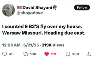 ووجد الفريق منشوراً على منصة إكس لشخص أميركي يدعى David Shayani، نشره صباح يوم 21 حزيران، قال فيه إنه أحصى تسع طائرات B2 حلقت فوق منزله في وارسو، بولاية ميسوري، متجهةً إلى الشرق. وهي الولاية التي تقع فيها ولاية “وايتمان” الجوية الأميركية.