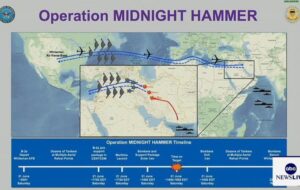 وعُرضت خلال المؤتمر، صورة لعملية “مطرقة منتصف الليل” والتي توضح مسار إطلاق الطائرات الأميركية من قاعدة قاعدة “وايتمان” الجوية في ولاية ميسوري، مروراً بالبحر الأبيض المتوسط ثم فلسطين والأردن والعراق إلى إيران.