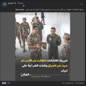 نَشرت صفحات عراقية على مواقع التواصل الاجتماعي، وخصوصاً على منصة فيسبوك، خبر نصه (دون تصرّف): “اميركا: القاذفات انطلقت من الأردن ثم مرت عبر العراق ونفذت الض*ربة على ايران”. وحصد الادعاء آلاف التفاعلات على منصة فيسبوك.