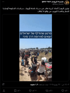 نَشرت صفحات -منها تعود لمستوطنين إسرائيليين- على مواقع التواصل الاجتماعي، وخصوصاً على منصة إكس، مقطع فيديو بالتزامن مع الصراع الإسرائيلي-الإيراني والهجمات المتبادلة، يظهر مسيراً طويلاً ومزدحماً، لأشخاص يحملون معدات وخيم، على أنه يوثق مغادرة أعداد كبيرة من المستوطنين الإسرائيليين عبر صحراء سيناء نحو أوروبا، وأرفق بنص (دون تصرّف): “توثيق اليوم | أعداد كبيرة تغادر عبر سيناء باتجاه أوروبا… سياسات الحكومة أوصلتنا للدمار ودَفعتنا للهروب من واقع لا يُطاق”. وحصد الفيديو أكثر من مليون مشاهدة، وأكثر من 19 ألف تفاعل في منشور واحد فقط على منصة إكس.