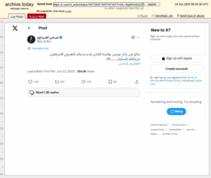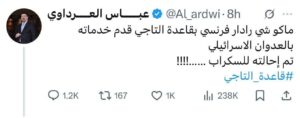 وقال العرداوي في تدوينته (دون تصرّف): “ماكو شي رادار فرنسي بقاعدة التاجي قدم خدماته بالعدوان الاسرائيلي تم إحالته للسكراب ……!!!! #قاعدة_التاجي”. قبل أن يقوم بحذفها لاحقاً، إلا أن فريق قام بأرشفتها من خلال أداة “archive.today” قبل أن يحذفها، لتكون متوفرة على الإنترنت حتى بعد حذفها.