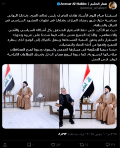 أما العامري، فقد ظهر اليوم في صورة جمعته مع زعيم تيار الحكمة عمار الحكيم لتبادل التهاني بمناسبة شهر رمضان.