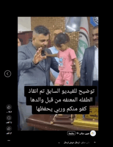 نَشرت صفحاتٌ على مواقع التواصل الاجتماعي وخصوصاً على منصة فيسبوك، مقطع فيديو مع نص مدمج داخل الفيديو (دون تصرّف): “توضيح للفيديو السابق تم انقاذ الطفله المعنفه من قبل والدها كفو منكم وربي يحفظه”. وقد حصد الفيديو أكثر من 84.7 الف تفاعل و6.1 الف تعليق في منشور واحد فقط على منصة فيسبوك.