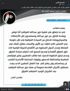 وبالبحث في حساب الصدر على منصة إكس، تبين أن آخر ما نشره كان “نعزي الأمة الإسلامية جمعاء باستشهاد الإمام السجاد عليه السلام فعظم الله أجورنا وأجوركم.. (تكملة التعزية)”. أما حساب وزيره فآخر ما نشره يوم 19 تموز الجاري، هو منشور للصدر أعلن من خلاله البدء باستقبال الزائرين من خارج العراق في “مضيف آل الصدر”. ونشر مقربون منه، اليوم، قصاصة ورقية مكتوب فيها بخط يد الصدر: “تعمر البلدان بحب الأوطان”. ولم يتم التطرق إلى قضية خور عبدالله.