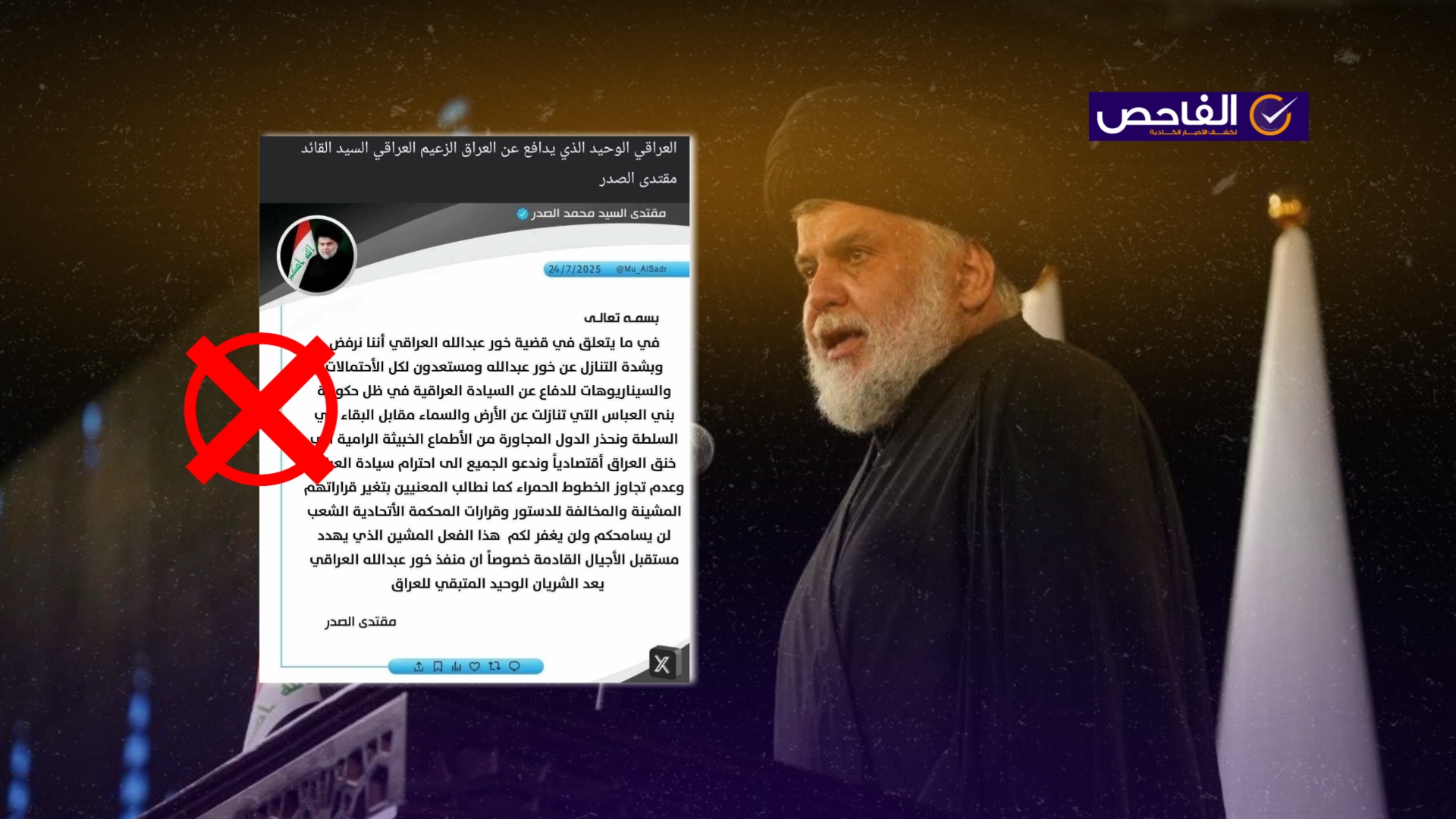نشرت صفحات على مواقع التواصل الاجتماعي، وخصوصاً على منصة فيسبوك، صورة منشور على منصة إكس، بمزاعم أن زعيم “التيار الوطني الشيعي” مقتدى الصدر، صرح عن موقفه بشأن قضية خور عبدالله، وأنه “مستعد لكل الاحتمالات والسيناريوهات للدفاع عن السيادة العراقية ويحذر الدول المجاورة من الأطماع الخبيثة الرامية الى خنق العراق اقتصادياً”. وأرفقت بالنص (دون تصرّف): “العراقي الوحيد الذي يدافع عن العراق الزعيم العراقي السيد القائد مقتدى الصدر”. وحصد الادعاء آلاف التفاعلات في منشورات متعددة على منصة فيسبوك.