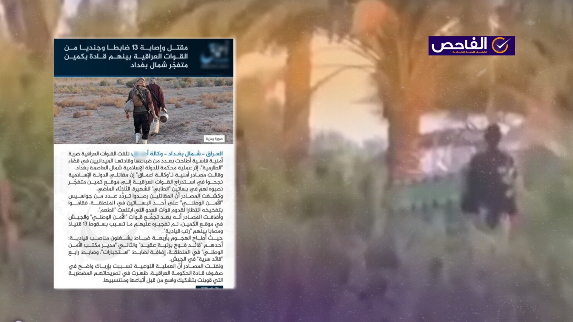 وقالت وكالة “أعماق” عن مصادر لها وعبر مواقع تابعة للتنظيم، إن عناصر التنظيم استدرجوا القوات العراقية إلى موقع كمين متفجّر نصبوه لهم في بساتين “الطابي” الشهيرة، الثلاثاء الماضي، حيث قاموا بتفخيخ الموقع انتظاراً لقدوم قوات الأمن العراقية.