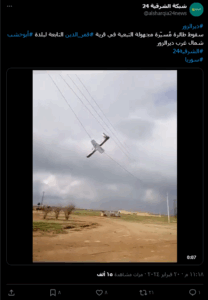 سقوط طائرة مُسيّرة مجهولة التبعية في قرية #قمر_الدين التابعة لبلدة #أبوخشب شمال غرب ديرالزور#الشرقية24#سوريا pic.twitter.com/ivue2uO4x0— شبكة الشرقية 24 (@alsharqia24news) February 20, 2024
