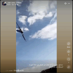 تداولت العديد من الصفحات على مواقع التواصل الاجتماعي، وخصوصاً على منصة فيسبوك، مقطع فيديو مع نص يزعم (دون تصرّف): “مسيرة إيرانية علقت في العراق على خط الكهرباء”. وحصد الادعاء مئات التفاعلات على منصة فيسبوك.