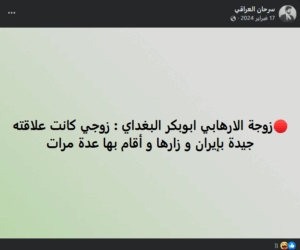 وينتشر هذا الادعاء الزائف بعد نشر قناة العربية المقابلة الخاصة مع زوجة البغدادي أسماء محمد، واتهام بعض الحسابات التعاون ما بين إيران وتنظيم داعش الإرهابي بالاعتماد على بعض التصريحات المزيفة.