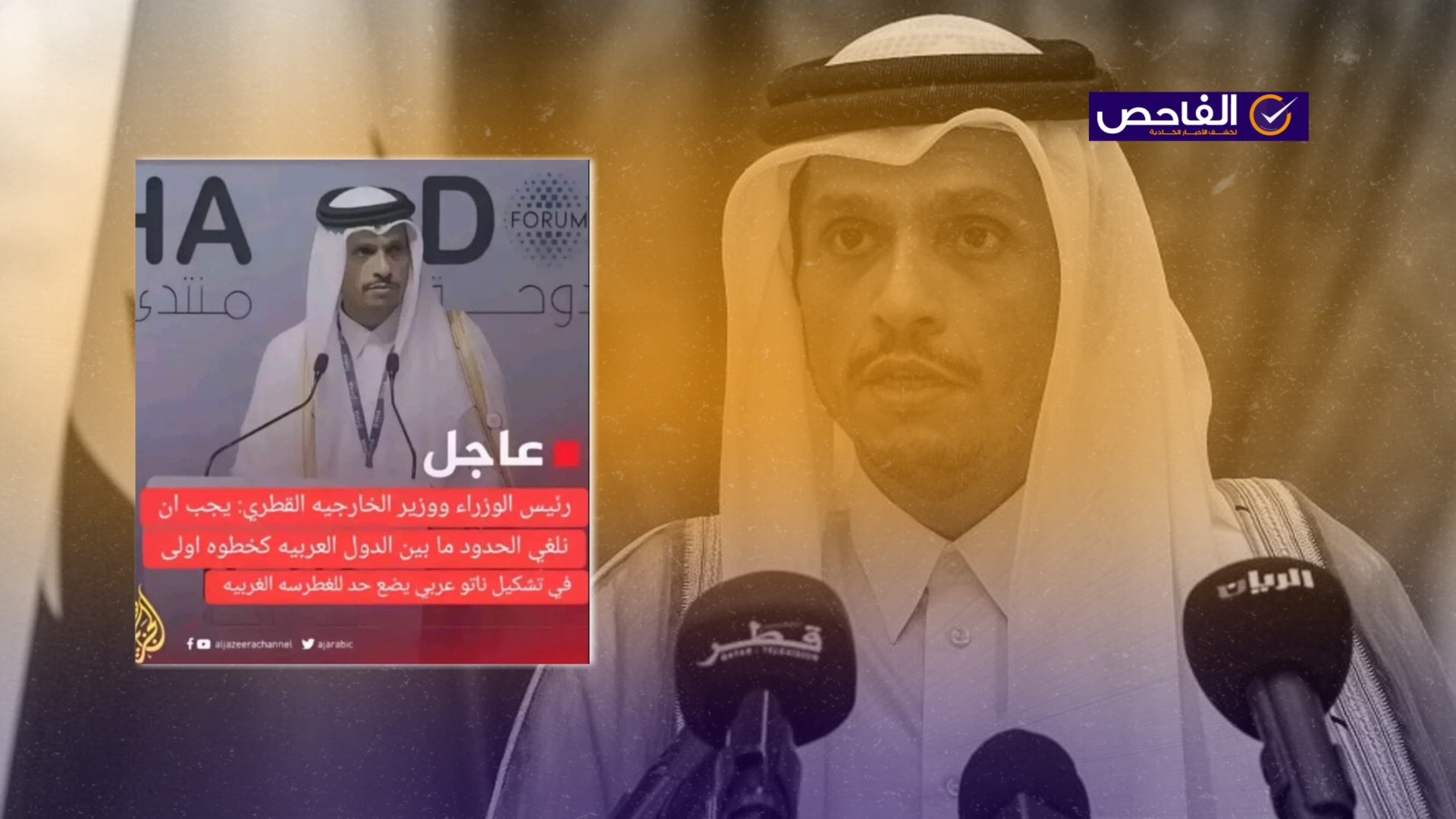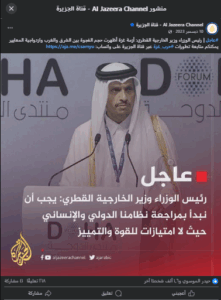 تتداول العديد من الحسابات على مواقع التواصل الاجتماعي تصريحاً منسوباً لرئيس الوزراء ووزير الخارجية القطري محمد بن عبد الرحمن آل ثاني، وتزعم المنشورات أنَّ قناة الجزيرة نشرت التصريح الذي ينص على: “يجب أن نلغي الحدود ما بين الدول العربية كخطوة أولى لتشكيل ناتو عربي يضع حد للغطرسة الغربية”. وحصل المنشور في أحد الحسابات على 468 تفاعل و182 تعليق و40 مشاركة.