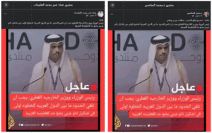 كما أنَّ “قناة الجزيرة” لم تنشر تصريحاً كهذا للخارجية القطرية، لكن تم استغلال قالب أخبارها والتعديل على صورة خبر آخر، والادّعاء بأنها قامت بنشره، وتتضح علامات التعديل على الصورة من أخطاء إملائية ونوع الخط ونسقه، ما ينفي الادّعاء المتداول.