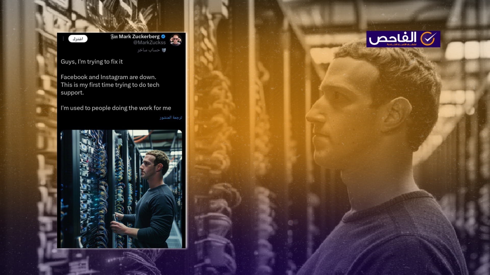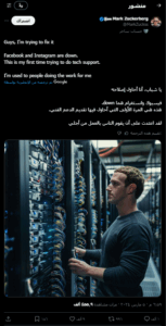 تتداول العديد من الحسابات على مواقع التواصل الاجتماعي، لقطة شاشة لمنشور من منصة إكس، تزعم أن المدير التنفيذي لشركة ميتا (مارك زوكربيرغ) نشره، مع خبر يزعم (دون تصرّف): “مارك زوكربيرغ يبرر توقف فيسبوك وانستغرام: يا رفاق، أحاول إصلاحه، الفيسبوك و انستغرام معطلة، هذه هي المرة الأولى التي أحاول فيها تقديم الدعم الفني، أنا معتاد على أن يقوم الأشخاص بالعمل نيابةً عني”. وحصد الادعاء آلاف التفاعلات على مختلف منصات التواصل الاجتماعي.