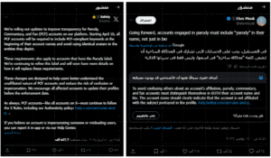 وأعلن إيلون ماسك في وقت سابق، عن أن كل حساب ينشر منتحلاً صفة شخص آخر بشكل ساخر، عليه أن يكتب بشكل واضح (Parody)، أي “محاكاة ساخرة” ليس فقط إلى جانب الاسم الذي ينتحله، بل في خانة التعريف أو ما يسمى الـ Bio أيضاً لتجنب إغلاقه.