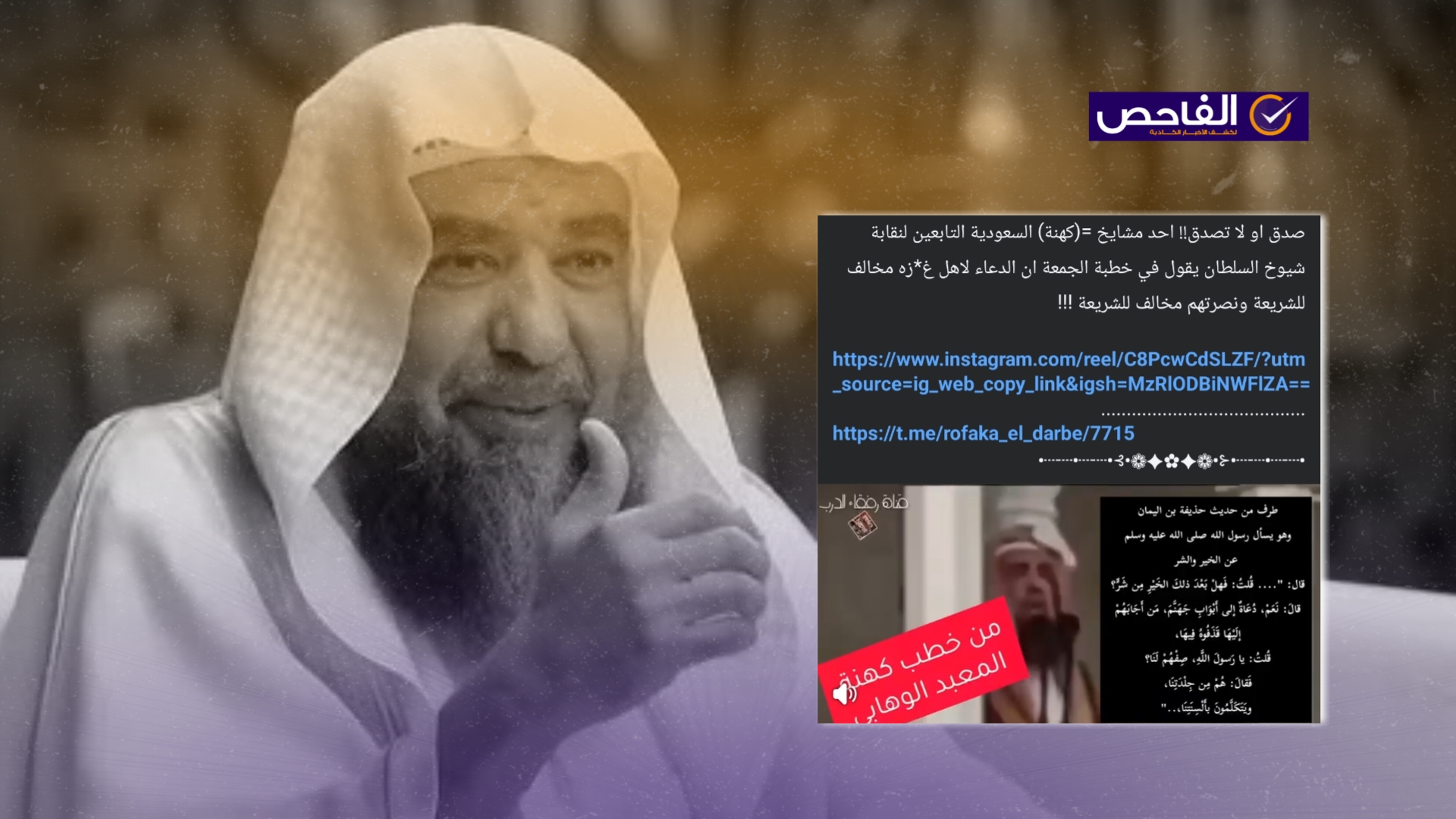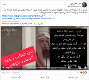 نشرت صفحات على مواقع التواصل الاجتماعي، وخصوصاً على منصة فيسبوك، مقطع فيديو وتم إرفاقه بنص مفاده (دون تصرّف): “احد مشايخ السعودية التابعين لنقابة شيوخ السلطان يقول في خطبة الجمعة ان الدعاء لاهل غزه مخالف للشريعة و نصرتهم مخالف للشريعة”. وحصد الفيديو مئات التفاعلات في منشورات متعددة على مختلف المنصات.