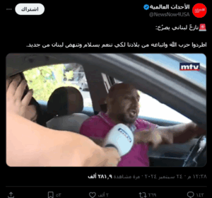 نَشرت صفحات على مواقع التواصل الاجتماعي، وخصوصاً على منصة إكس، تصريحاً منسوباً للنازح اللبناني الذي ظهر في لقاء مع قناة “MTV”، على أنَّه قال (دون تصرّف): “اطردوا حزب الله واتباعه من بلادنا لكي ننعم بسلام وتنهض لبنان من جديد”. وحصد الادعاء آلاف التفاعلات على منصة إكس.