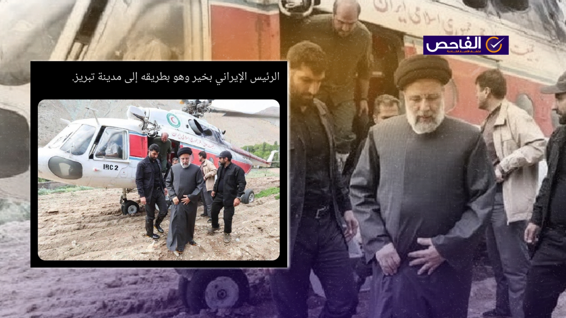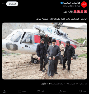 نَشرت صفحاتٌ على مواقع التواصل الاجتماعي، وخصوصاً على منصة إكس، صورةً تُظهر الرئيس الإيراني إبراهيم رئيسي مترجلاً من طائرة مروحية، بالتزامن مع الأخبار التي تتحدث عن تعرض الطائرة التي تقله لحادث فقدت على أثره، ونشرت الصورة مع نص (دون تصرّف): “الصورة نشرتها وكالات إيرانية والرئيس الإيراني بخير”. وحصد الادعاء آلاف التفاعلات على منصة إكس.