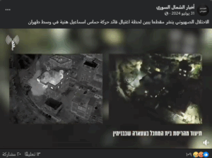 تداولت صفحات على مواقع التواصل الاجتماعي، وخصوصاً على منصة فيسبوك، مقطع فيديو مع نص (دون تصرّف): “الاحتلال الصهيوني ينشر مقطعا يبين لحظة اغتيال قائد حركة حماس اسماعيل هنية في وسط طهران”. وحقق الادعاء تفاعل واسع على منصة فيسبوك.