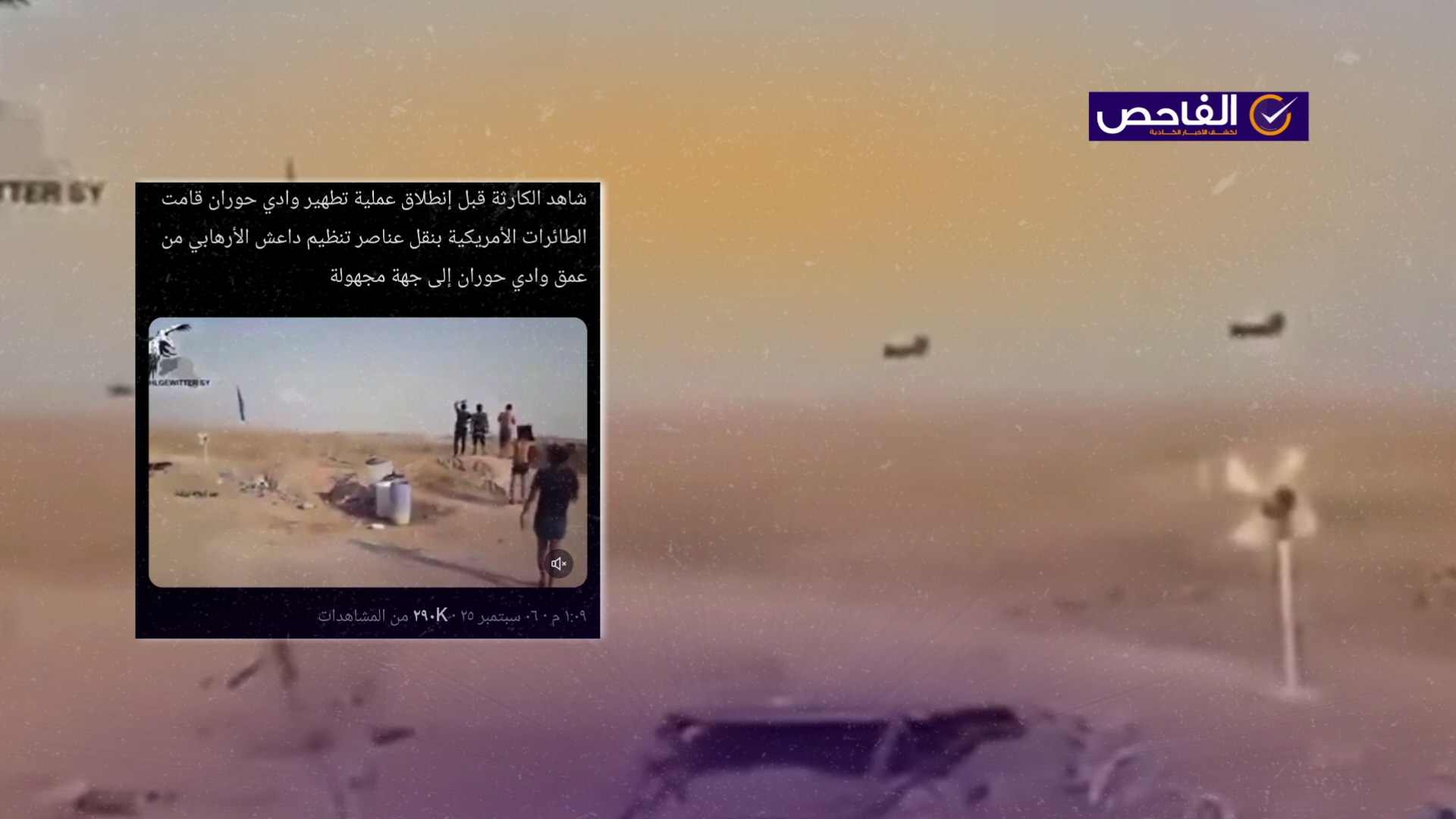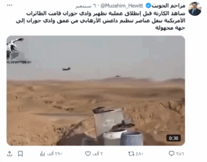 نشرت صفحات على مواقع التواصل الاجتماعي، وخصوصاً على منصة إكس، مقطع فيديو على أنه لطائرات أميركية تنقل أفراد من تنظيم داعش، وتم إرفاقه بنص مفاده (دون تصرّف): “شاهد الكارثة قبل إنطلاق عملية تطهير وادي حوران قامت الطائرات الأمريكية بنقل عناصر تنظيم داعش الأرهابي من عمق وادي حوران إلى جهة مجهولة “. وحقق الفيديو انتشاراً واسعاً وحصد أكثر من 290 ألف مشاهدة في منشور واحد على منصة إكس.
