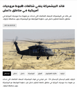 وفي سياق الفيديو المنشور عام 2017، وجد فريقنا تصريحات عن قوات البيشمركة في 30 حزيران من العام ذاته، نقلتها مؤسسة “كوردستان 24” الإعلامية الكوردية، نفت من خلالها الأخبار المزعومة حول إلقاء مروحيات أميركية إمدادات لتنظيم داعش، أو هبوطها في المناطق التي يسيطر عليها التنظيم، كما وصفت قيادة التحالف الدولي من جهتها، الاتهامات بأنها “سخيفة ومجنونة” بحسب التقرير.