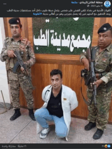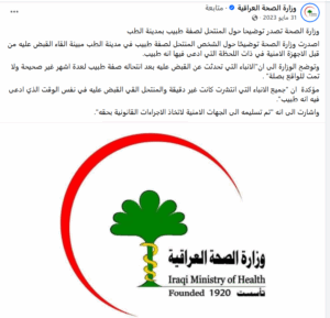 وإضافة إلى ذلك، أصدرت وزارة الصحة العراقية آنذاك توضيحاً بعد تداول فيديو إلقاء القبض على الشخص المنتحل، جاء فيه: “ان جميع الانباء التي انتشرت كانت غير دقيقة والمنتحل القي القبض عليه في نفس الوقت الذي ادعى فيه انه طبيب”.