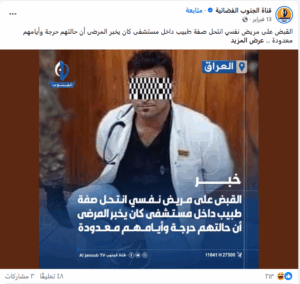 نَشرت صفحاتٌ على مواقع التواصل الاجتماعي وخصوصاً على منصة فيسبوك، خبراً يزعم (دون تصرّف): “القبض على مريض نفسي انتحل صفة طبيب داخل مستشفى بنص مفاده (دون تصرّف): “القبض على مريض نفسي انتحل صفة طبيب داخل مستشفى كان يخبر المرضى أن حالتهم حرجة وأيامهم معدودة “. وحصد الخبر آلاف التفاعلات على مواقع التواصل الاجتماعي.