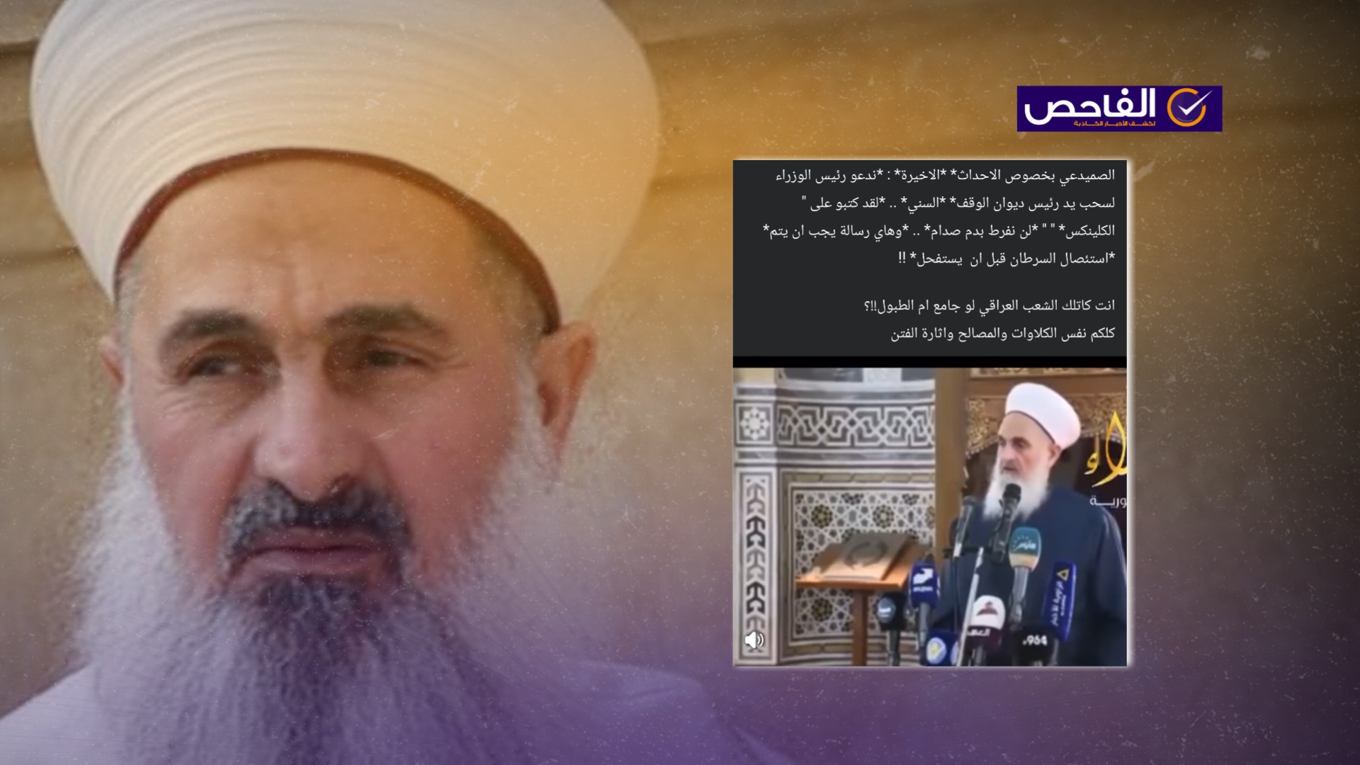 بعد التحقيق من قبل فريق الفاحص، والبحث العكسي عن الفيديو، تبين أنه مضلل، إذ أنه نًشر بتاريخ 1 كانون الأول 2023 على قناة دار الإفتاء العراقية، وليس مرتبطاً بالأحداث الحالية، حيث طالب الصميدعي آنذاك بإقالة رئيس ديوان الوقف السني، مشعان الخزرجي، بسبب خلافات بينهما.