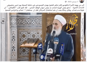 وقال الصميدعي، آنذاك، خلال خطبة الجمعة التي ألقاها في مسجد “أم الطبول” إن على رئيس الوزراء اتخاذ قرار يحمي الشعب العراقي، وأن يسحب يد رئيس ديوان الوقف السني بشكل فوري.