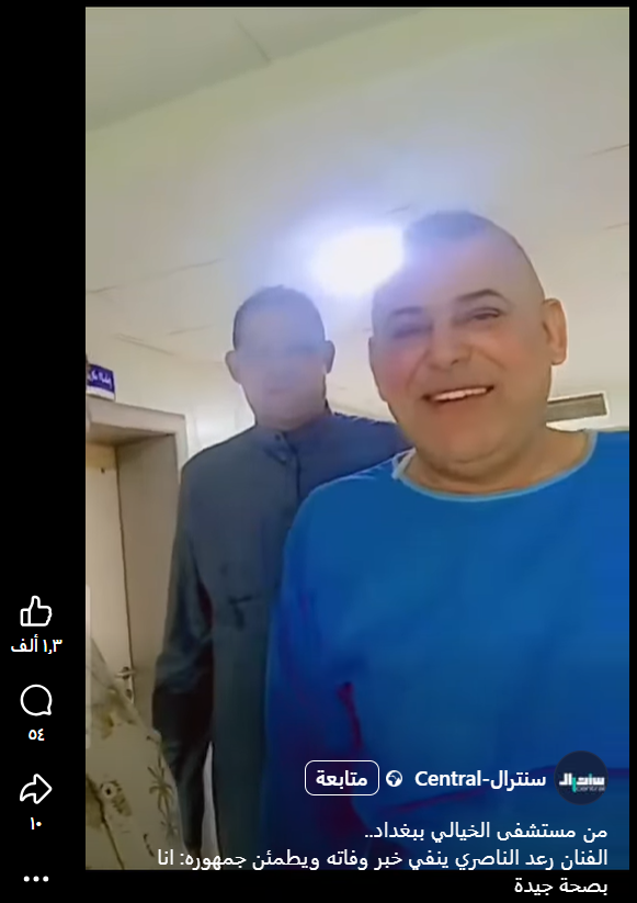 وبالإضافة إلى ذلك، نشرت صفحة “سنترال” مقطع فيديو مع الفنان رعد الناصري من داخل المستشفى، نفى أيضاً من خلاله الادعاء المتداول.