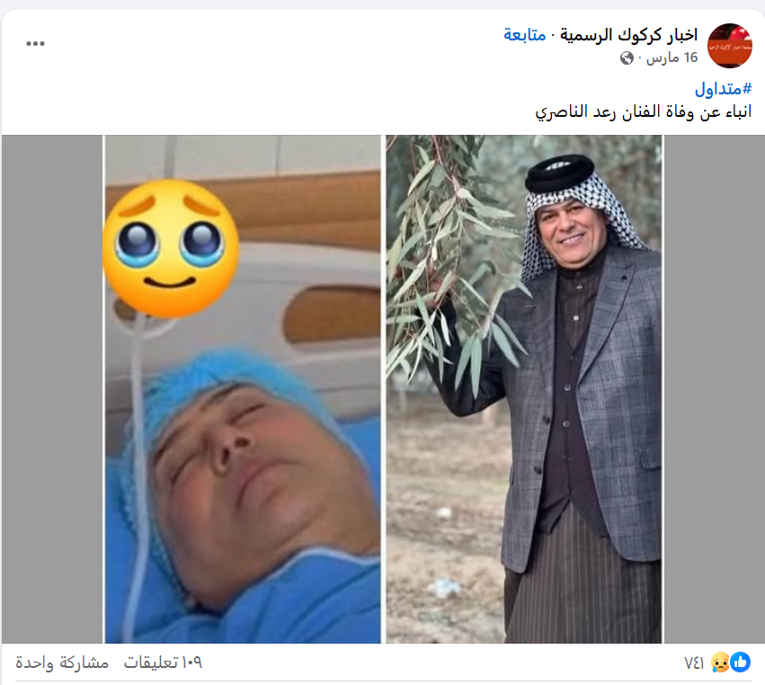 نَشرت صفحاتٌ على مواقع التواصل الاجتماعي، وخصوصاً على منصة فيسبوك، بالتزامن مع تدهور الحالة الصحية للفنان العراقي الشهير رعد الناصري، نشرت خبراً مفاده (دون تصرّف): “انباء عن وفا.ة الفنان رعد الناصري”. وحصد الادعاء آلاف التفاعلات في منشورات متعددة على منصة فيسبوك.