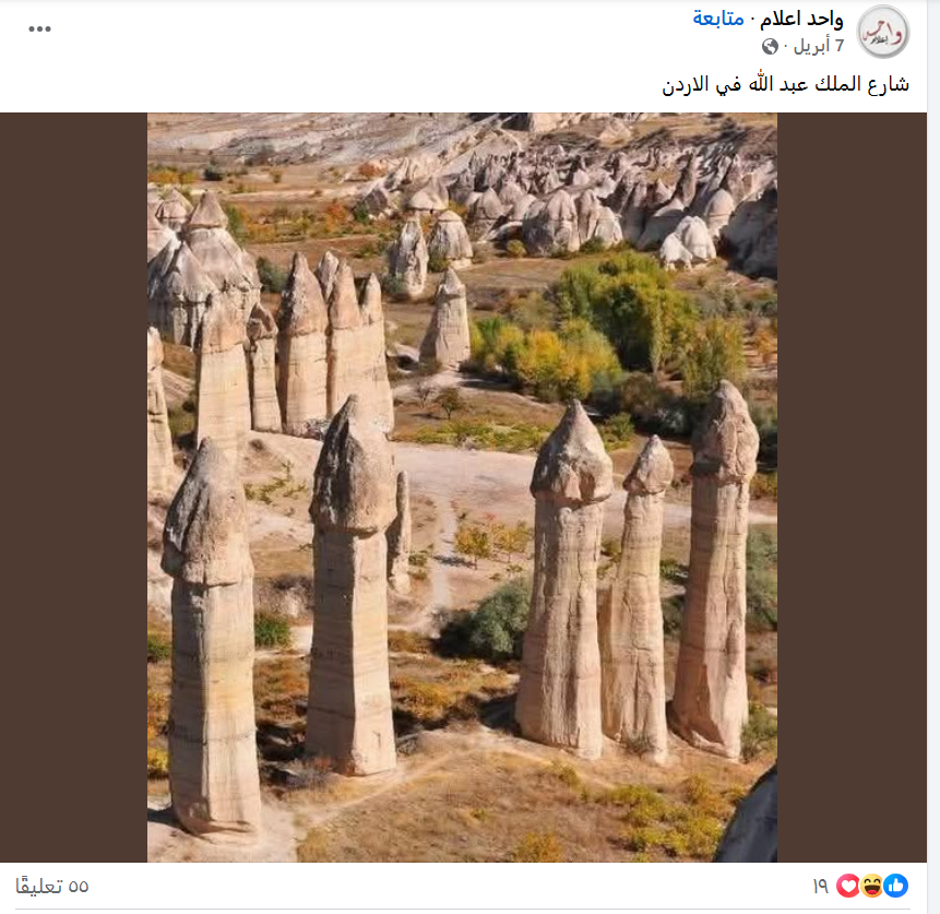 نَشرت صفحاتٌ على مواقع التواصل الاجتماعي، وخصوصاً على منصة فيسبوك في سياق التنمّر، صورة تظهر أعمدة صخرية بمزاعم (دون تصرّف): “شارع الملك عبد الله في الاردن”. وحصد الادعاء آلاف التفاعلات على منصة فيسبوك.
