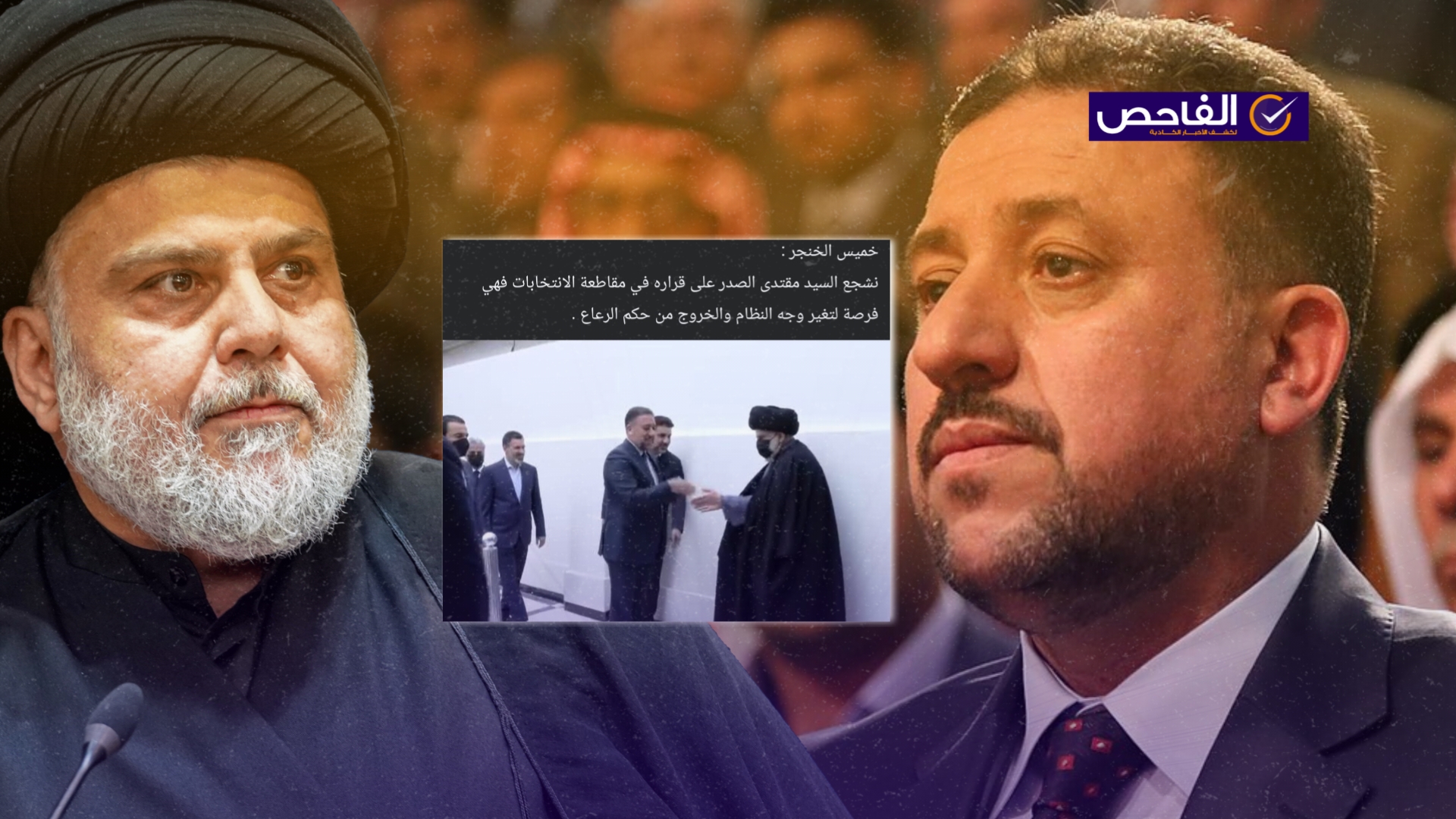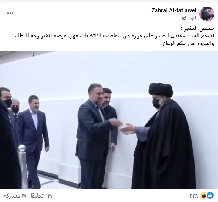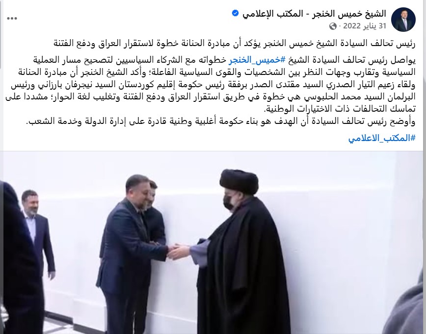 تداولت صفحات على مواقع التواصل الاجتماعي، وخصوصاً على منصة فيسبوك، صورة تجمع رئيس تحالف “السيادة” مع زعيم “التيار الوطني الشيعي” مقتدى الصدر، ومرفقة بخبر نصه (دون تصرّف): “خميس الخنجر :نشجع السيد مقتدى الصدر على قراره في مقاطعة الانتخابات فهي فرصة لتغير وجه النظام والخروج من حكم الرعاع”. وحصد الادعاء مئات التفاعلات على منصات التواصل الاجتماعي.