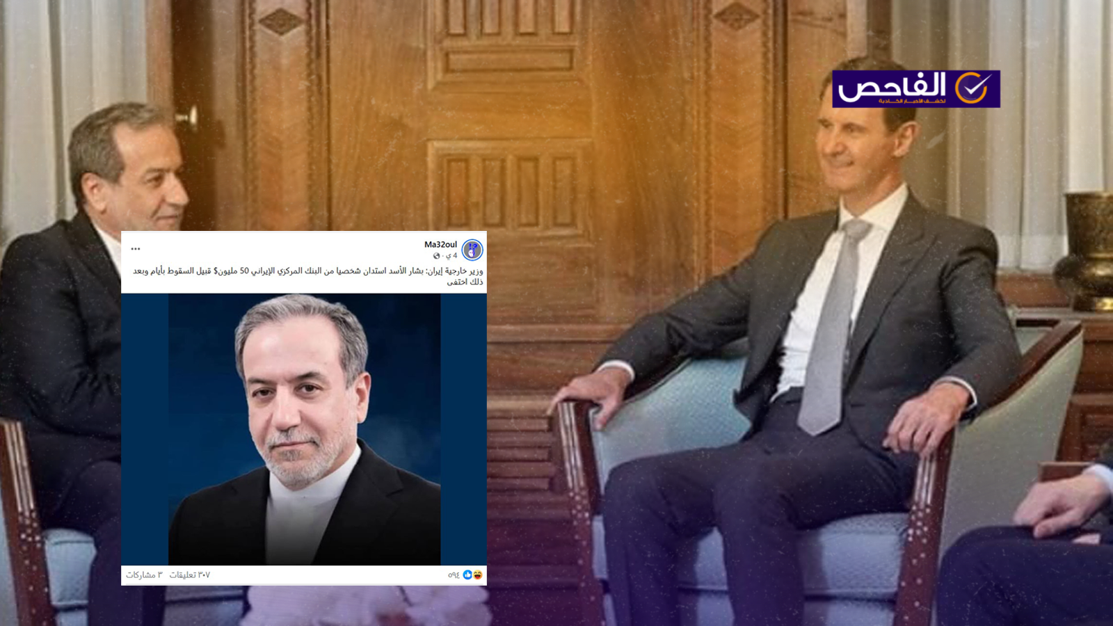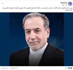 تداولت صفحات على مواقع التواصل الاجتماعي، وخصوصاً على منصة فيسبوك، تصريحاً منسوباً إلى وزير الخارجية الإيراني، نصه (دون تصرّف): “وزير خارجية إيران: بشار الأسد استدان شخصيا من البنك المركزي الإيراني 50 مليون$ قبيل السقوط بأيام وبعد ذلك اختفى”. وحصد الادعاء تفاعلاً واسعاً على منصة فيسبوك.