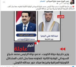 تداولت صفحات على مواقع التواصل الاجتماعي، وخصوصاً على منصّة فيسبوك، خبراً نصّه (دون تصرّف): “وزير خارجية الكويت: ندعم دولة الرئيس محمد شياع السوداني للولاية الثانية لتعاونه معنا بحل أغلب المشاكل الكويتية العراقية وابرزها مينا خور عبدالله الكويتي.”. وحصد المنشور مئات التفاعلات في منشورات متعددة على منصّة فيسبوك.