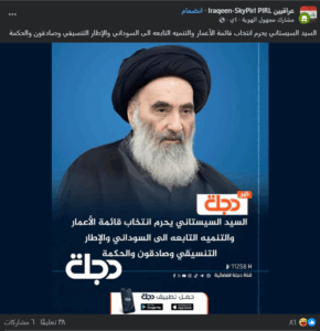 تداولت صفحات على مواقع التواصل الاجتماعي، وخصوصاً على منصة فيسبوك، خبراً نصّه (دون تصرّف): “السيد السيستاني يحرم انتخاب قائمة الأعمار والتنميه التابعه الى السوداني والإطار التنسيقي وصادقون والحكمة”. وحصد الادعاء مئات التفاعلات في منشورات متعددة على منصّة فيسبوك.