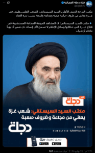 وبعد فحص الصورة المتداولة للادّعاء، تبين أنها مفبركة، حيث تم استخدام قالب أخبار قناة “دجلة” الفضائية، التي لم تنشر أي منشور مشابه في صفحاتها، واتضح أن الصورة الأصلية نشرت يوم 25 تموز الماضي، ونصّ الخبر فيها على: “مكتب السيد السيستاني: شعب غزة يعاني من مجاعة وظروف صعبة”.