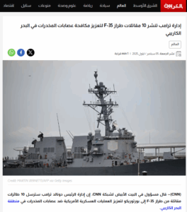 وفي البحث عن الأخبار المتعلقة بالنزاع الدائر بين الولايات المتحدة الامريكية وفنزويلا على خلفية اتهام الأول للأخير بضلوعها في تجارة المخدرات ونقلها إلى أميركا، أكدت تقارير إعلامية نقلاً عن مصادر ومسؤولين أميركيين بأن الحكومة قامت بنشر طائرات شبحية من طراز F-35B Lightning II في مطار في بورتوريكو في منطقة الكاريبي، هدفها تعزيز القدرات الامريكية الموسعة لمكافحة تهريب المخدرات في منطقة جنوب الكاريبي.