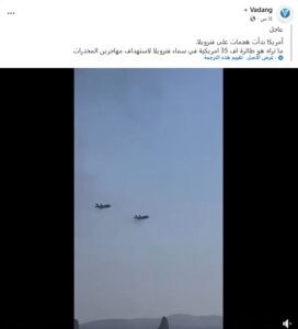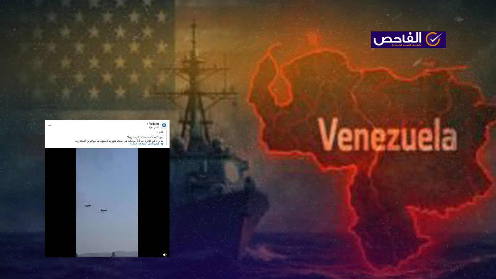 تداولت حسابات على منصات التواصل الاجتماعي مقطع فيديو مع ادعاء باللغة الكوردية نصه (دون تصرف): “بەپـــــەلە ئەمریکا هێرشی بۆسەر ڤەنزوێلا دەستپێکرد، ئەوەی دەیبینن فڕۆکەی F35 ی ئەمریکیە لەسەر ئاسمانی وڵاتی ڤەنزوێلا بۆ بە ئامانجگرتنی قاچاخچیانی مادەی هۆشبەر“. وترجمته: “أميركا بدأت الهجوم على فنزويلا، وما ترونه هو طائرات أمريكية من طراز F35 تحلق فوق فنزويلا لاستهداف تجار المخدرات”. إضافة لانتشار الادعاء بلغات أخرى في أوقات سابقة على منصة إكس. وحصد المنشور مئات التفاعلات على منصّات التواصل الاجتماعي.