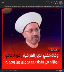 تداولت صفحات على مواقع التواصل الاجتماعي، وخصوصاً على منصة فيسبوك، خبراً بمزاعم وفاة مفتي الديار العراقية السابق، رافع الرفاعي، في منزله ببغداد بعد يومين من وصوله، مرفقاً بنص مفاده (دون تصرّف): “#عاجل | انتقل إلى رحمة الله مفتي الديار العراقية، رافع الرفاعي، في منزله ببغداد، بعد يومين من وصوله”. وحصد الادعاء آلاف التفاعلات في منشورات متعددة على منصة فيسبوك.