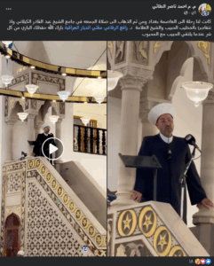 وخلال البحث، عثرنا على مقطع فيديو من خطبة ألقاها رافع الرفاعي ظهر يوم الجمعة -بعد تداول ادعاء وفاته- في جامع الشيخ عبد القادر الكيلاني في بغداد، وهو ما يؤكد أنه لا يزال على قيد الحياة.