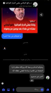 وبالإضافة إلى ذلك، تواصل فريق الفاحص مع الصفحة الإعلامية الرسمية لرافع الرفاعي على منصة فيسبوك، وأكدت عدم صحة الخبر، ونفت إشاعة وفاته بشكل قاطع.