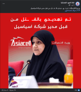 تداولت صفحات على مواقع التواصل الاجتماعي، وخصوصاً على منصة فيسبوك، تصريحاً منسوباً لوزيرة الاتصالات هيام الياسري، بمزاعم أنها قالت (دون تصرّف): “تم تــ ـهـــ ـديدي بالـ ـقــ ـتل من قبل مدير شركة اسياسيل”. وحصد الادعاء آلاف التفاعلات في منشورات متعددة على منصة فيسبوك.