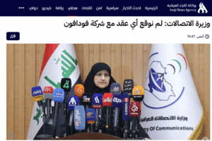 وينتشر هذا الادعاء الزائف في سياق الجدل الدائر حول نية وزارة الاتصالات توقيع اتفاقات مع شركة “فودافون” واعتراض العديد من شركات الاتصال في العراق على هذا المشروع.