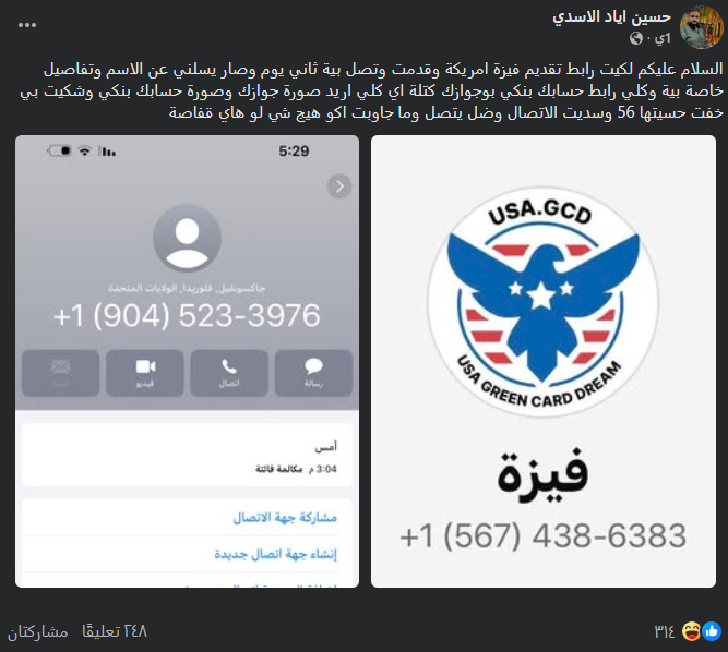 وفيما يتعلق برقم الهاتف المتصل “3976 -523(904) 1+” الظاهر في لقطة الشاشة، فهو رقم تابع لمنطقة جاكسونفيل، فلوريدا، الولايات المتحدة. إلا أن الاتصال من هذا النوع من الأرقام، خاصة بعد يوم واحد من تقديم الطلب -كما ذكر صاحب التجربة- وطلب صور الجواز وتفاصيل الحساب البنكي، يؤكد أن سلوك المتصل هو محاولة احتيال مالي وسرقة بيانات شخصية وليس اتصالاً حكومياً رسمياً يتسم بالبروتوكولات الآمنة، إذ عمليات معالجة طلبات الحصول على التأشيرة، تتطلب وقتاً لمراجعة المستندات المقدمة وباقي المعلومات.