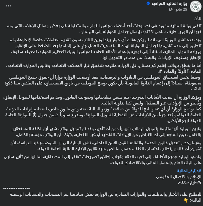 وعند البحث في صفحات وزارة المالية العراقية، تبين أنها نشرت توضيحاً في أيار الماضي، قالت فيه إنه “فيما يخص استحقاق الموظفين من العلاوات والترفيعات، فقد أوضحت الوزارة مراراً أن حقوق جميع الموظفين محفوظة، استناداً إلى إعمام الدائرة القانونية بأن يكون ترفيع الموظف من تاريخ الاستحقاق، على العكس مما ذكره النائب”. ما ينفي صحة الادعاء.